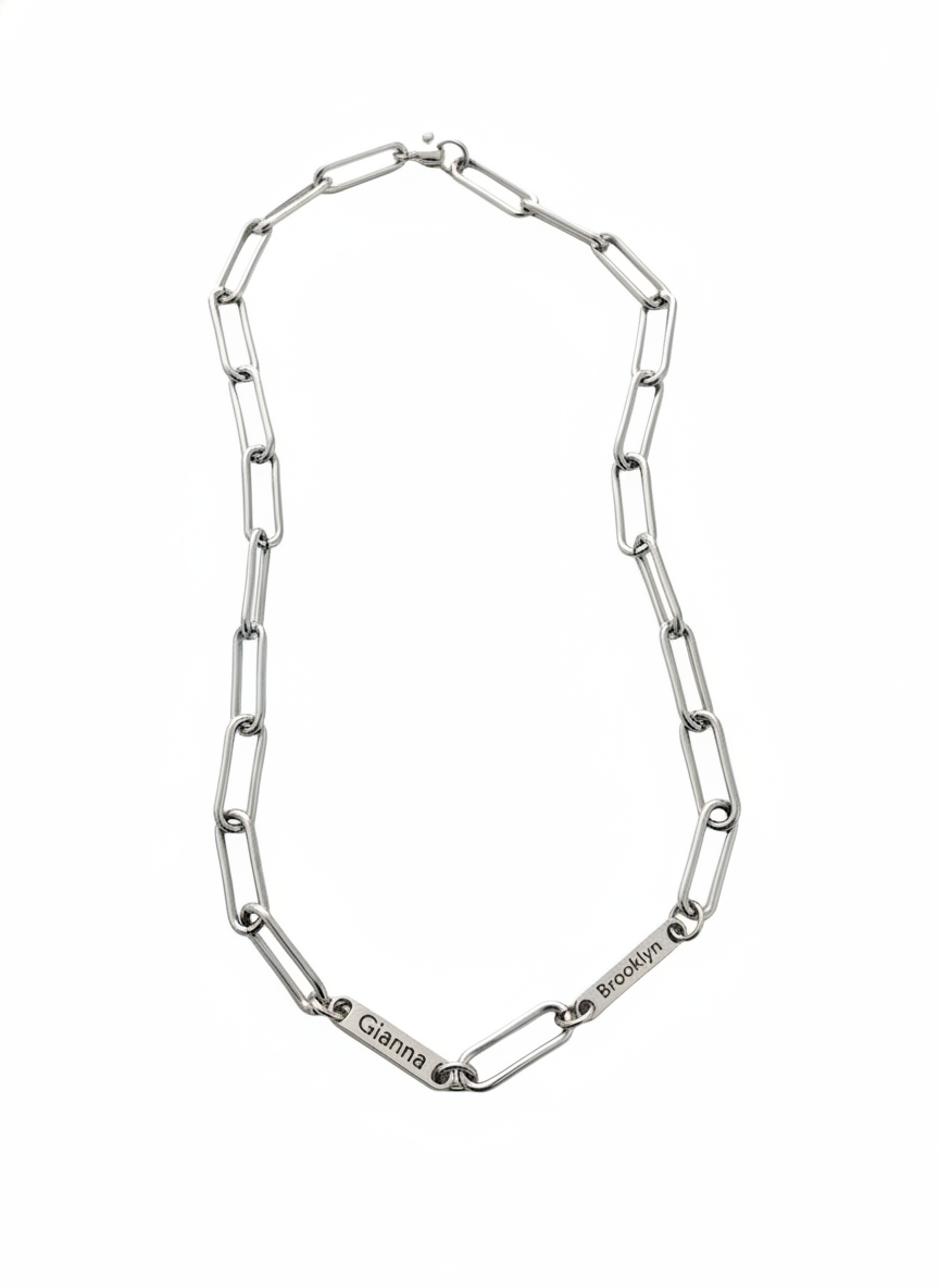 Cadena de eslabones tipo paperclip en acero inoxidable con baño de oro 18k, diseñada para quienes valoran la calidad y el estilo contemporáneo. Con una longitud de 16 pulgadas más extensión de 2 pulgadas, ofrece versatilidad y comodidad al cuello. Elige entre 1, 2 o 3 piezas en blanco para personalizar con nombres, fechas o frases que sean significativas para ti. Material resistente y acabado premium que garantiza durabilidad y brillo duradero, creando una joya única y exclusiva.